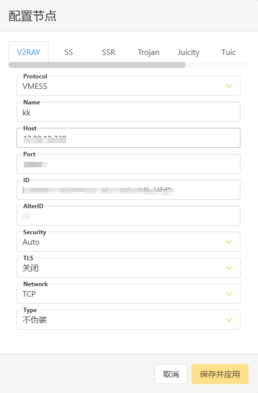 windows客户端配置方法:打开客户端点击右上方的加号,在出现的下拉列表中选择手动输入[Vmess],然后找到相应区域输入别名(remark,任意名称均可)、服务器IP地址(address)和之前记下的显示在V2Ray配置文件中的几项参数(Port,ID,alterID),还有一项是Security,是选择加密方式,可以自己在下拉列表中选择,和配置文件中的设置无关,建议选择Chacha20-poly1305。输入完成后点击右上方的勾号确定,再点击右下方的连接按钮就可以连接到服务器了。